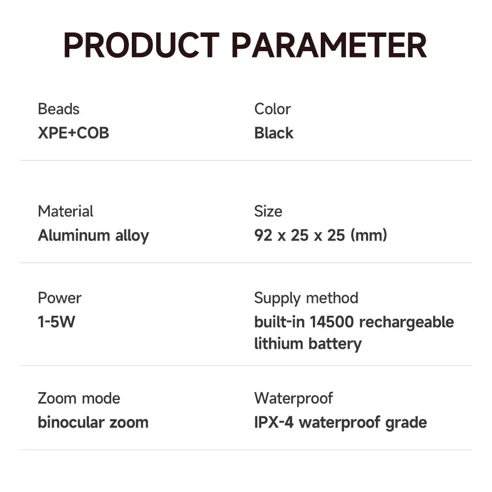 4: This rechargeable flashlight is small in size and light in weight. It is suitable for being put into a pocket, backpack or shoulder bag, or even clipped on a key chain. It is a universal tool for walking at night or other outdoor activities.